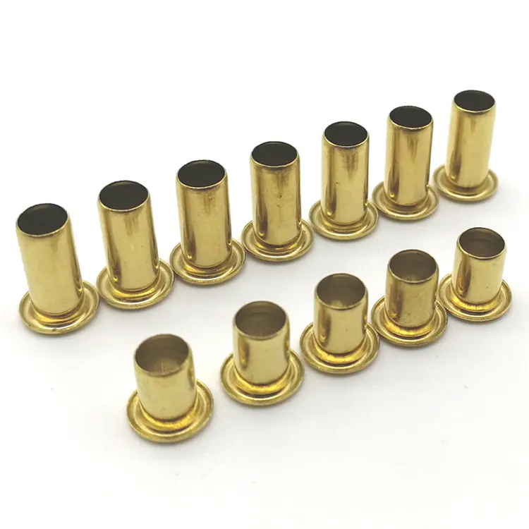 Los remaches con ojales se pueden revestir con níquel blanco, estaño pulido, oro de imitación, bronce antiguo, níquel mate, bronce, zinc y plata. Ofrecemos una amplia variedad de estilos y una amplia gama de remaches de ojal de precisión y respetuosos con el medio ambiente. Podemos personalizarlos según su muestra o dibujo. Las tolerancias estándar para remaches de ojal son: ±0,05 mm para el diámetro del tubo, ±0,1 mm para la altura y ±0,15 mm para el diámetro de la tapa. También podemos producir según las especificaciones individuales del cliente.